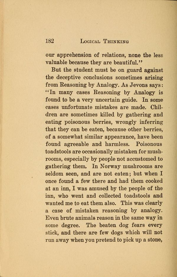 But the student must be on guard against the deceptive conclusions sometimes arising from Reasoning by Analogy. As Jevons, says: In many cases Reasoning by Analogy is found to be a very uncertain guide. In some cases unfortunate mistakes are made. Children are sometimes killed by gathering and eating poisonous berries, wrongly inferring that they can be eaten, because other berries, of a somewhat similar appearance, have been found agreeable and harmless. Poisonous toadstools are occasionally mistaken for mushrooms, especially by people not accustomed to gathering them. In Norway mushrooms are seldom seen, and are not eaten but when I once found a few there and had them cooked at an bin, I was amused by the people of the inn, who went and collected toadstools and wanted me to eat them also. This was clearly a case of mistaken reasoning by analogy. Even brute animals reason in the same way in some degree. The beaten dog fears every stick, and there are few dogs which will not run away when you pretend to pick up a stone,
