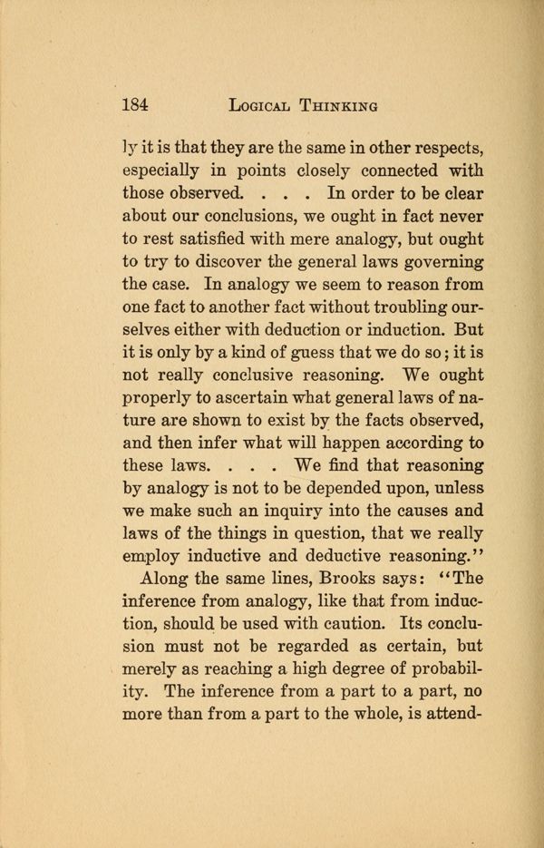 Along the same lines, Brooks says: "The inference from analogy, like that from induction, should be used with caution. Its conclusion must not be regarded as certain, but merely as reaching a. high degree of probability. The inference from a part to a part, no more than from a part to the whole, is attended