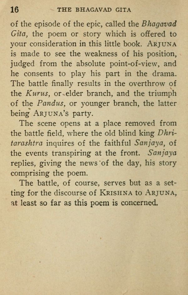 of the episode of the epic, called the Bhagavad Gita, the poem or story which is offered to your consideration in this little book. Arjuna is made to see the weakness of his position, judged from the absolute point-of-view, and he consents to play his part in the drama. The battle finally results in the overthrow of the Kurus, or elder branch, and the triumph of the Pandus, or younger branch, the latter being Arjuna's party.