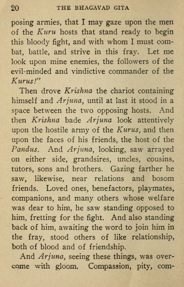 Then drove Krishna the chariot containing himself and Arjuna, until at last it stood in a space between the two opposing hosts. And then Krishna bade Arjuna look attentively upon the hostile army of the Kurus, and then upon the faces of his friends, the host of the Pandits. And Arjuna, looking, saw arrayed on either side, grandsires, uncles, cousins, tutors, sons and brothers. Gazing farther he saw, likewise, near relations and bosom friends. Loved ones, benefactors, playmates, companions, and many others whose welfare was dear to him, he saw standing opposed to him, fretting for the fight. And also standing back of him, awaiting the word to join him in the fray, stood others of like relationship, both of blood and of friendship.