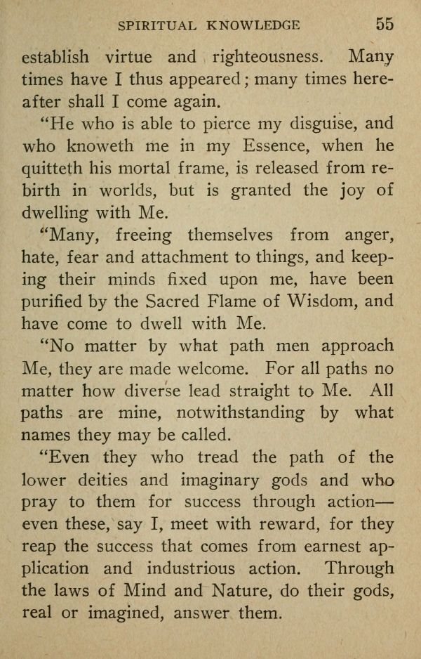 "Even they who tread the path of the lower deities and imaginary gods and who pray to them for success through action -- even these, say I, meet with reward, for they reap the success that comes from earnest application and industrious action. Through the laws of Mind and Nature, do their gods, real or imagined, answer them.