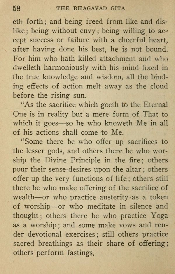 "Some there be who offer up sacrifices to the lesser gods, and others there be who worship the Divine Principle in the fire; others pour their sense-desires upon the altar; others offer up the very functions of life; others still there be who make offering of the sacrifice of wealth --- or who practice austerity as a token of worship --- or who meditate in silence and thought; others there be who practice Yoga as a worship; and some make vows and render devotional exercises; still others practice sacred breathings as their share of offering; others perform fastings.