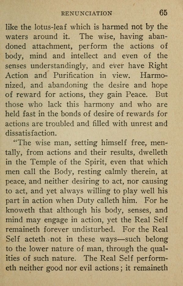 like the lotus-leaf which is harmed not by the waters around it. The wise, having abandoned attachment, perform the actions of body, mind and intellect and even of the senses understanding^, and ever have Right Action and Purification in view. Harmonized, and abandoning the desire and hope of reward for actions, they gain Peace. But those who lack this harmony and who are held fast in the bonds of desire of rewards for actions are troubled and filled with unrest and dissatisfaction.