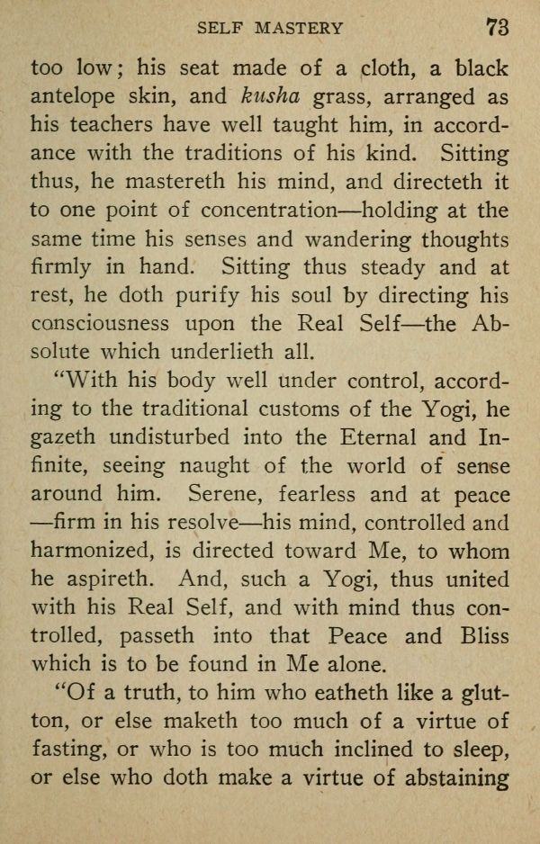 too low; his seat made of a cloth, a black antelope skin, and kusha grass, arranged as his teachers have well taught him, in accordance with the traditions of his kind. Sitting thus, he mastereth his mind, and directeth it to one point of concentration --- holding at the same time his senses and wandering thoughts firmly in hand. Sitting thus steady and at rest, he doth purify his soul by directing his consciousness upon the Real Self --- the Absolute which underlieth all.