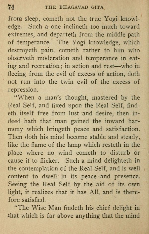 from sleep, cometh not the true Yogi knowledge. Such a one inclineth too much toward extremes, and departeth from the middle path of temperance. The Yogi knowledge, which destroyeth pain, cometh rather to him who observeth moderation and temperance in eating and recreation; in action and rest --- who in fleeing from the evil of excess of action, doth not run into the twin evil of the excess of repression.
