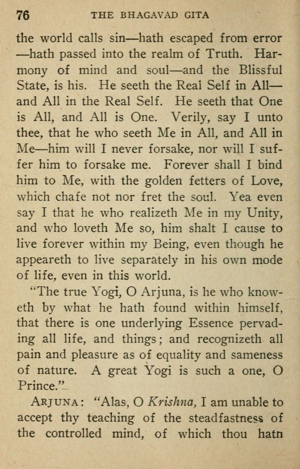 the world calls sin --- hath escaped from error --- hath passed into the realm of Truth. Harmony of mind and soul --- and the Blissful State, is his. He seeth the Real Self in All -- and All in the Real Self. He seeth that One is All, and All is One. Verily, say I unto thee, that he who seeth Me in All, and All in Ale --- him will I never forsake, nor will I suffer him to forsake me. Forever shall I bind him to Me, with the golden fetters of Love, which chafe not nor fret the soul. Yea even say I that he who realizeth Me in my Unity, and who loveth Me so, him shalt I cause to live forever within my Being, even though he appeareth to live separately in his own mode of life, even in this world.