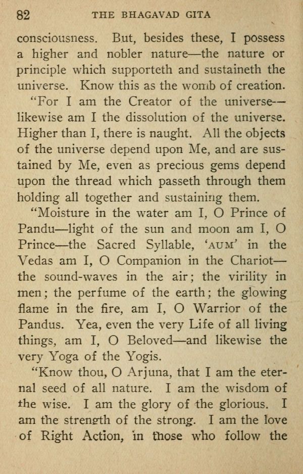 ''For I am the Creator of the universe -- likewise am I the dissolution of the universe. Higher than I, there is naught. All the objects of the universe depend upon M e, and are sustained by Me, even as precious gems depend upon the thread which passeth through them holding all together and sustaining them.