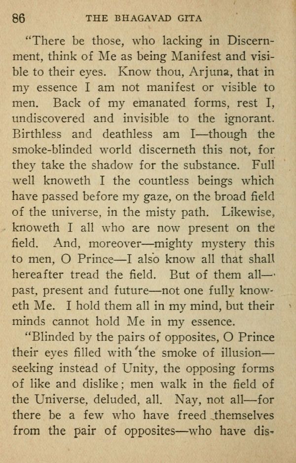 "Blinded by the pairs of opposites, O Prince their eyes filled with 'the smoke of illusion -- seeking instead of Unity, the opposing forms of like and dislike; men walk in the field of the Universe, deluded, all. Nay, not all --- for there be a few who have freed themselves from the pair of opposites --- who have dis*