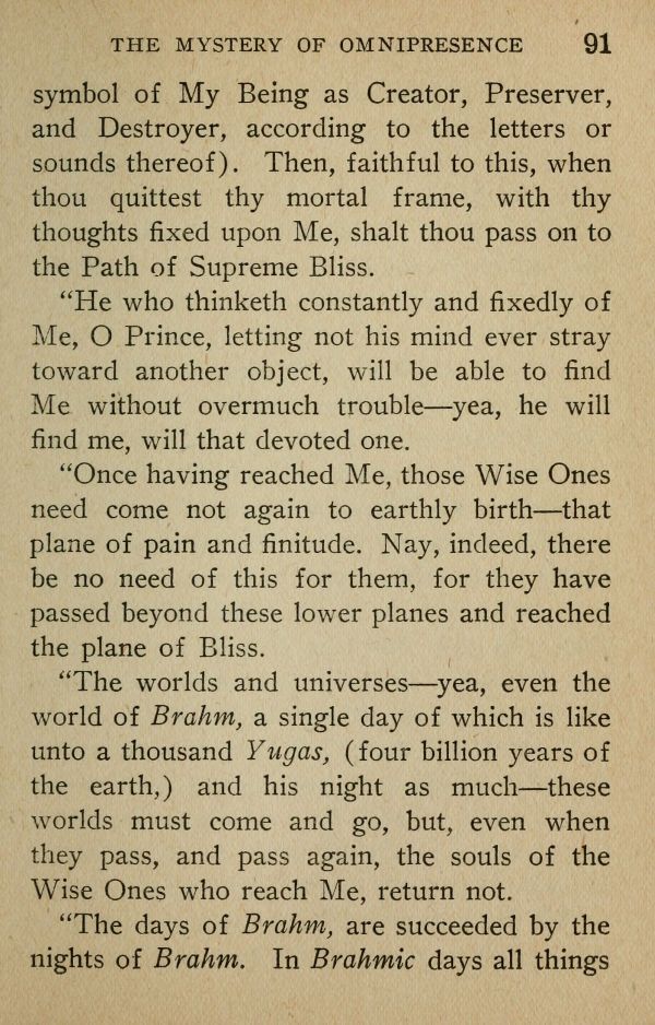 symbol of My Being as Creator, Preserver, and Destroyer, according to the letters or sounds thereof). Then, faithful to this, when thou quittest thy mortal frame, with thy thoughts fixed upon Me, shalt thou pass on to the Path of Supreme Bliss.