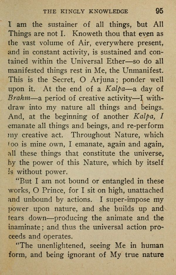 I am the sustainer of all things, but All Things are not I. Knoweth thou that even as the vast volume of Air, everywhere present, and in constant activity, is sustained and contained within the Universal Ether --- so do all manifested things rest in Me, the Unmanifest. This is the Secret, O Arjuna; ponder well upon it. At the end of a Kalpa --- a day of Brahm --- a period of creative activity --- I withdraw into my nature all things and beings. And, at the beginning of another Kalpa, I emanate all things and beings, and re-perform my creative act. Throughout Nature, which too is mine own, I emanate, again and again, all these things that constitute the universe, r>y the power of this Nature, which by itself is without power.