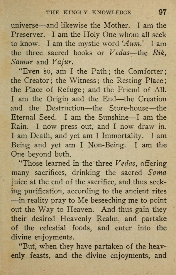 universe --- and likewise the Mother. I am the Preserver. I am the Holy One whom all seek to know. I am the mystic word 'Aum.' I am the three sacred books or Vedas--- the Rik, Samur and Yajur.