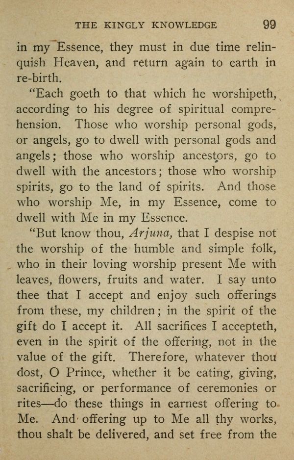 "But know thou, Arjuna, that I despise not the worship of the humble and simple folk, who in their loving worship present Me with leaves, flowers, fruits and water. I say unto thee that I accept and enjoy such offerings from these, my children; in the spirit of the gift do I accept it. All sacrifices I accepteth, even in the spirit of the offering, not in the value of the gift. Therefore, whatever thou dost, O Prince, whether it be eating, giving, sacrificing, or performance of ceremonies or rites --- do these things in earnest offering to. Me. And offering up to Me all thy works, thou shalt be delivered, and set free from the