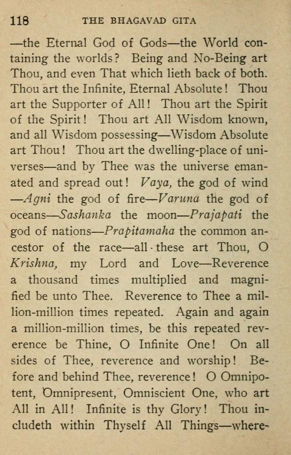 --- the Eternal God of Gods --- the World containing the worlds? Being and No-Being art Thou, and even That which lieth back of both. Thou art the Infinite, Eternal Absolute! Thou art the Supporter of All! Thou art the Spirit of the Spirit! Thou art All Wisdom known, and all Wisdom possessing --- Wisdom Absolute art Thou! Thou art the dwelling-place of universes --- and by Thee was the universe emanated and spread out! Vaya, the god of wind --- Agni the god of fire --- Varuna the god of oceans --- Sashanka the moon --- Prajapati the god of nations --- Prapitamaha the common ancestor of the race --- all • these art Thou, O Krishna, my Lord and Love --- Reverence a thousand times multiplied and magnified be unto Thee. Reverence to Thee a million-million times repeated. Again and again a million-million times, be this repeated reverence be Thine, O Infinite One! On all sides of Thee, reverence and worship! Before and behind Thee, reverence! O Omnipotent, Omnipresent, Omniscient One, who art All in All! Infinite is thy Glory! Thou includeth within Thyself All Things --- where-