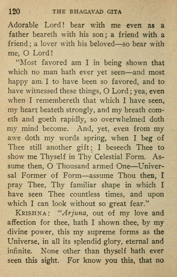"Most favored am I in being shown that which no man hath ever yet seen --- and most happy am I to have been so favored, and to have witnessed these things, O Lord; yea, even when I remembereth that which I have seen, my heart beateth strongly, and my breath cometh and goeth rapidly so overwhelmed doth my mind become. And, yet, even from my awe doth my words spring, when I beg of Thee still another gift; I beseech Thee to show me Thyself in Thy Celestial Form. Assume then, O Thousand armed One --- Universal Former of Form --- assume Thou then, I pray Thee, Thy familiar shape in which I have seen Thee countless times, and upon which I can look without so great fear."