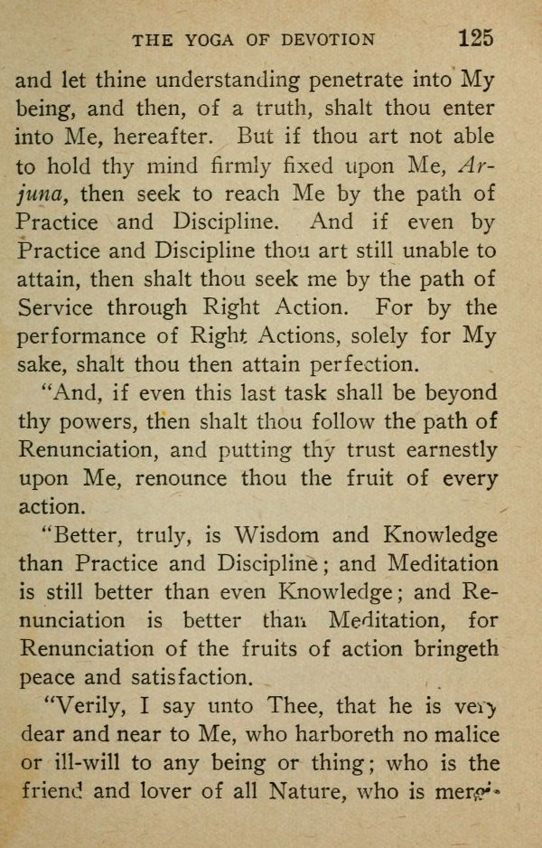 and let thine understanding penetrate into My being, and then, of a truth, shalt thou enter into Me, hereafter. But if thou art not able to hold thy mind firmly fixed upon Me, Arjuna, then seek to reach Me by the path of Practice and Discipline. And if even by Practice and Discipline thou art still unable to attain, then shalt thou seek me by the path of Service through Right Action. For by the performance of Right Actions, solely for My sake, shalt thou then attain perfection.