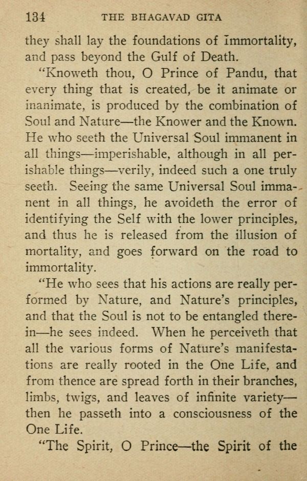"Knoweth thou, O Prince of Pandu, that every thing that is created, be it animate or inanimate, is produced by the combination of Soul and Nature --- the Knower and the Known. He who seeth the Universal Soul immanent in all things --- imperishable, although in all perishable things --- verily, indeed such a one truly seeth. Seeing the same Universal Soul immanent in all things, he avoideth the error of identifying the Self with the lower principles, and thus he is released from the illusion of mortality, and goes forward on the road to immortality.