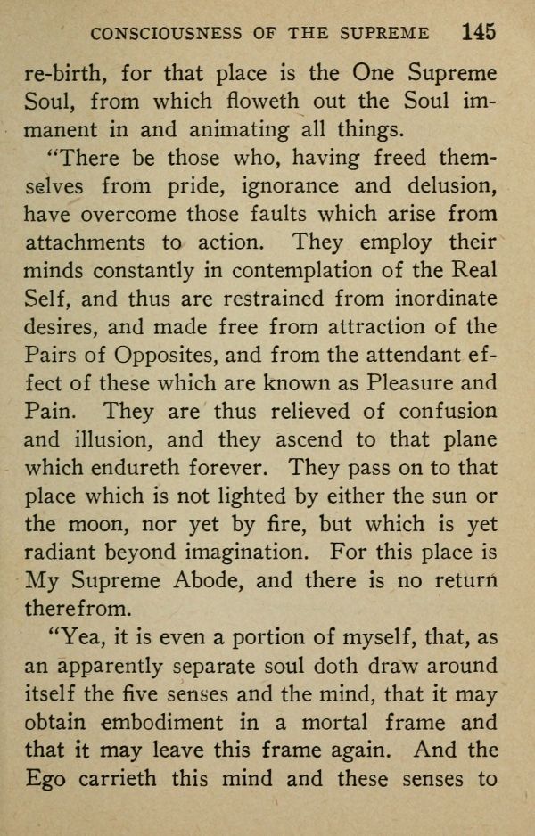 "There be those who, having freed themselves from pride, ignorance and delusion, have overcome those faults which arise from attachments to action. They employ their minds constantly in contemplation of the Real Self, and thus are restrained from inordinate desires, and made free from attraction of the Pairs of Opposites, and from the attendant effect of these which are known as Pleasure and Pain. They are thus relieved of confusion and illusion, and they ascend to that plane which endureth forever. They pass on to that place which is not lighted by either the sun or the moon, nor yet by fire, but which is yet radiant beyond imagination. For this place is My Supreme Abode, and there is no return therefrom.
