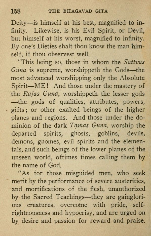 "This being so, those in whom the Sattvas Guna is supreme, worshippeth the Gods --- the most advanced worshipping only the Absolute Spirit --- ME! And those under the mastery of the Rajas Guna, worshippeth the lesser gods --- the gods of qualities, attributes, powers, gifts; or other exalted beings of the higher planes and regions. And those under the dominion of the dark Tamas Guna, worship the departed spirits, ghosts, goblins, devils, demons, gnomes, evil spirits and the elementals, and such beings of the lower planes of the unseen world, ofttimes times calling them by the name of God.