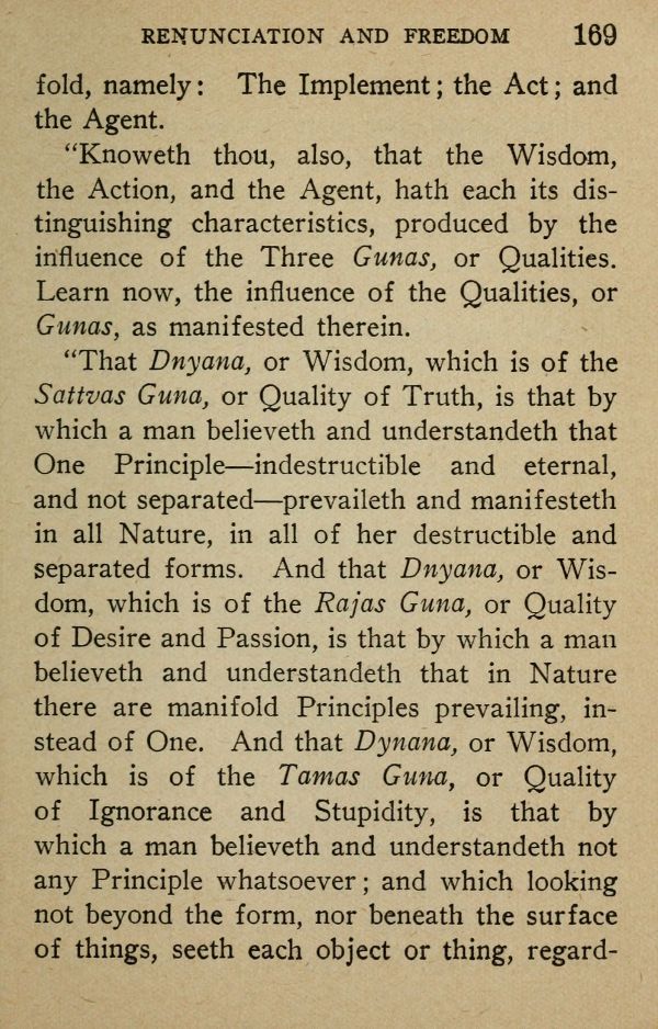 "That Dnyana, or Wisdom, which is of the Sattvas Guna, or Quality of Truth, is that by which a man believeth and understandeth that One Principle --- indestructible and eternal, and not separated --- prevaileth and manifesteth in all Nature, in all of her destructible and separated forms. And that Dnyana, or Wisdom, which is of the Rajas Guna, or Quality of Desire and Passion, is that by which a man believeth and understandeth that in Nature there are manifold Principles prevailing, instead of One. And that Dynana, or Wisdom, which is of the Tamas Guna, or Quality of Ignorance and Stupidity, is that by which a man believeth and understandeth not any Principle whatsoever; and which looking not beyond the form, nor beneath the surface of things, seeth each object or thing, regard-