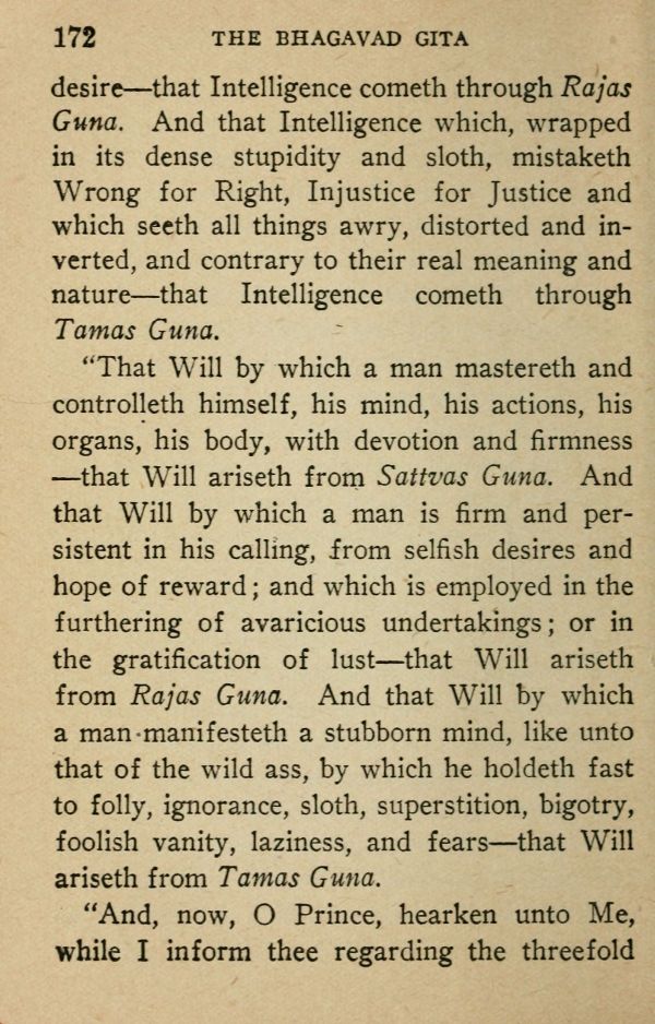 "That Will by which a man mastereth and controlleth himself, his mind, his actions, his organs, his body, with devotion and firmness --- that Will ariseth from Sattvas Guna. And that Will by which a man is firm and persistent in his calling, from selfish desires and hope of reward; and which is employed in the furthering of avaricious undertakings; or in the gratification of lust --- that Will ariseth from Rajas Guna. And that Will by which a man-manifesteth a stubborn mind, like unto that of the wild ass, by which he holdeth fast to folly, ignorance, sloth, superstition, bigotry, foolish vanity, laziness, and fears --- that Will ariseth from Tamas Guna.