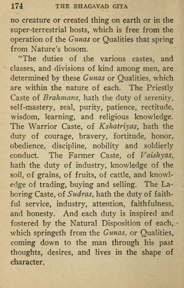 'The duties of the various castes, and classes, and divisions of kind among men, are determined by these Gunas or Qualities, which are within the nature of each. The Priestly Caste of Brahmans, hath the duty of serenity, self-mastery, zeal, purity, patience, rectitude, wisdom, learning, and religious knowledge. The Warrior Caste, of Kshatriyas, hath the duty of courage, bravery, fortitude, honor, obedience, discipline, nobility and soldierly conduct. The Farmer Caste, of Vaishyas, hath the duty of industry, knowledge of the soil, of grains, of fruits, of cattle, and knowledge of trading, buying and selling. The Laboring Caste, of Sudras, hath the duty of faithful service, industry, attention, faithfulness, and honesty. And each duty is inspired and fostered by the Natural Disposition of each, which springeth from the Gunas, or Qualities, coming down to the man through his past thoughts, desires, and lives in the shape of character.