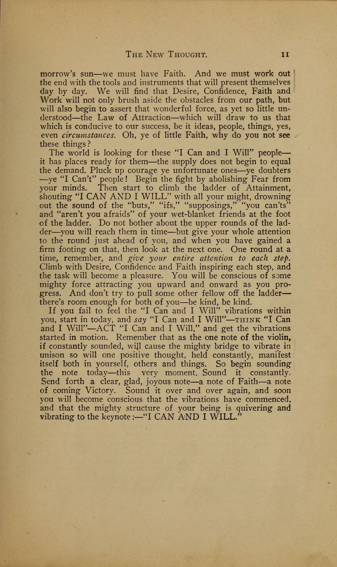 If you fail to feel the "I Can and I Will" vibrations within you, start in today, and say "I Can and I Will" --- think "I Can and I Will" --- ACT "I Can and I Will," and get the vibrations started in motion. Remember that as the one note of the violin, if constantly sounded, will cause the mighty bridge to vibrate in unison so will one positive thought, held constantly, manifest itself both in yourself, others and things. So begin sounding the note today --- this very moment. Sound it constantly. Send forth a clear, glad, joyous note --- a note of Faith --- a note of coming Victory. Sound it over and over again, and soon you will become conscious that the vibrations have commenced, and that the mighty structure of your being is quivering and vibrating to the keynote: --- "I CAN AND I WILL."