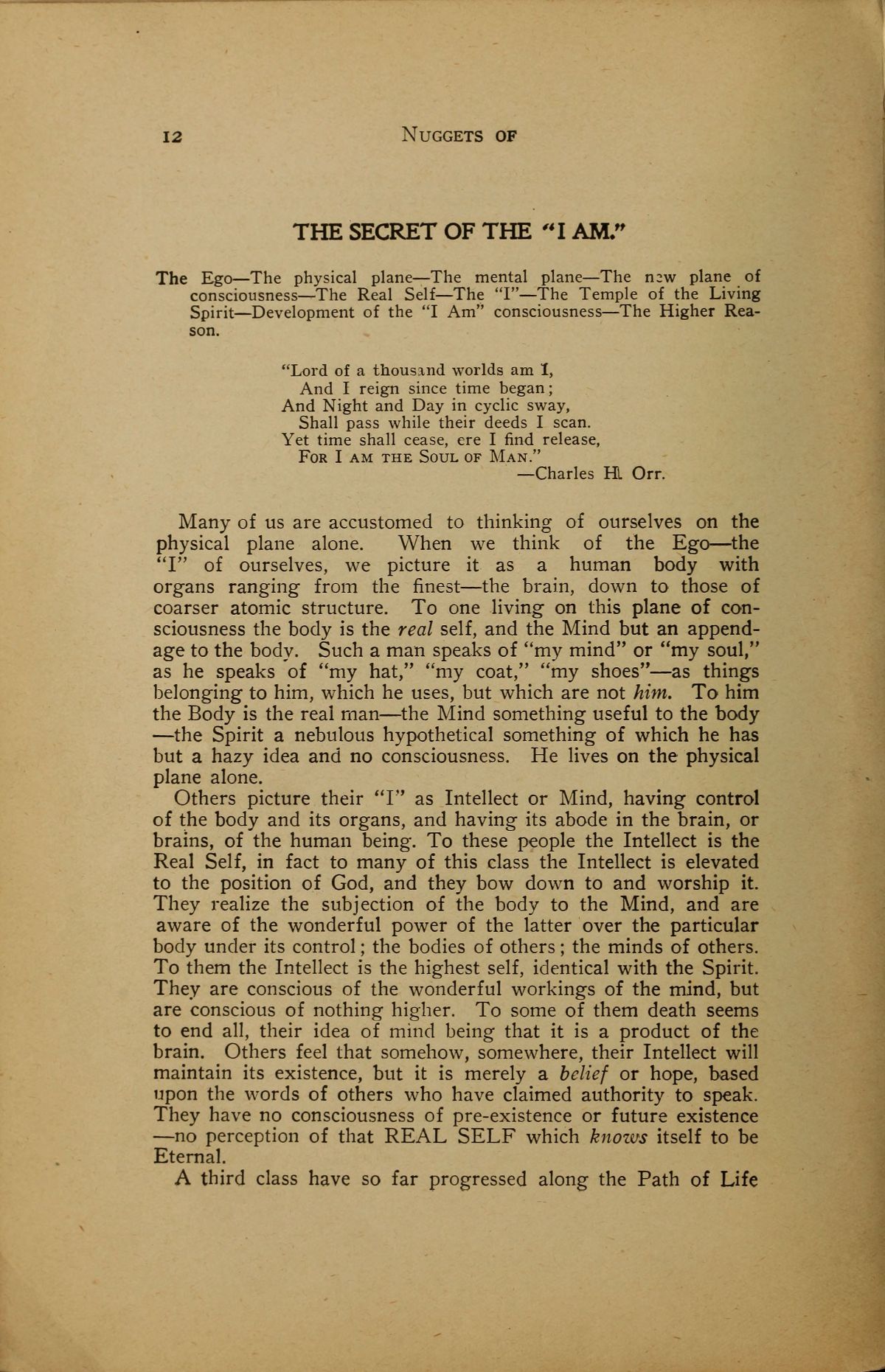 Many of us are accustomed to thinking of ourselves on the physical plane alone. When we think of the Ego --- the "I" of ourselves, we picture it as a human body with organs ranging from the finest --- the brain, down to those of coarser atomic structure. To one living on this plane of consciousness the body is the real self, and the Mind but an appendage to the body. Such a man speaks of "my mind" or "my soul," as he speaks of "my hat," "my coat," "my shoes" --- as things belonging to him, which he uses, but which are not him. To him the Body is the real man --- the Mind something useful to the body --- the Spirit a nebulous hypothetical something of which he has but a hazy idea and no consciousness. He lives on the physical plane alone.