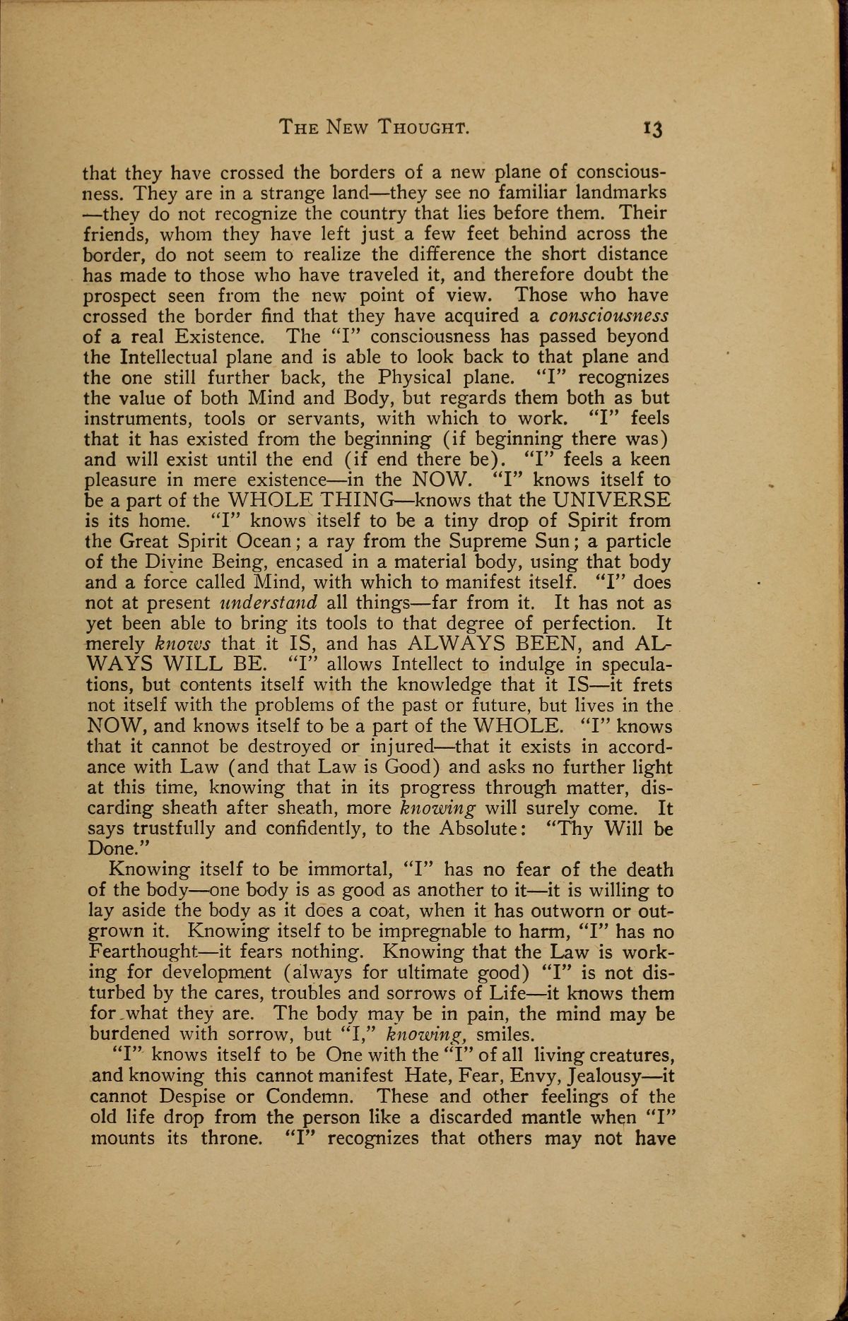 that they have crossed the borders of a new plane of consciousness. They are in a strange land --- they see no familiar landmarks --- they do not recognize the country that lies before them. Their friends, whom they have left just a few feet behind across the border, do not seem to realize the difference the short distance has made to those who have traveled it, and therefore doubt the prospect seen from the new point of view. Those who have crossed the border find that they have acquired a consciousness of a real Existence. The "I" consciousness has passed beyond the Intellectual plane and is able to look back to that plane and the one still further back, the Physical plane. "I" recognizes the value of both Mind and Body, but regards them both as but instruments, tools or servants, with which to work. "I" feels that it has existed from the beginning (if beginning there was) and will exist until the end (if end there be). "I" feels a keen pleasure in mere existence --- in the NOW. "I" knows itself to be a part of the WHOLE THING --- knows that the UNIVERSE is its home. "I" knows itself to be a tiny drop of Spirit from the Great Spirit Ocean; a ray from the Supreme Sun; a particle of the Divine Being, encased in a material body, using that body and a force called Mind, with which to manifest itself. "I" does not at present understand all things --- far from it. It has not as yet been able to bring its tools to that degree of perfection. It merely knows that it IS, and has ALWAYS BEEN, and ALWAYS WILL BE. "I" allows Intellect to indulge in speculations, but contents itself with the knowledge that it IS --- it frets not itself with the problems of the past or future, but lives in the NOW, and knows itself to be a part of the WHOLE. "I" knows that it cannot be destroyed or injured --- that it exists in accordance with Law (and that Law is Good) and asks no further light at this time, knowing that in its progress through matter, discarding sheath after sheath, more knowing will surely come. It says trustfully and confidently, to the Absolute: "Thy Will be Done."