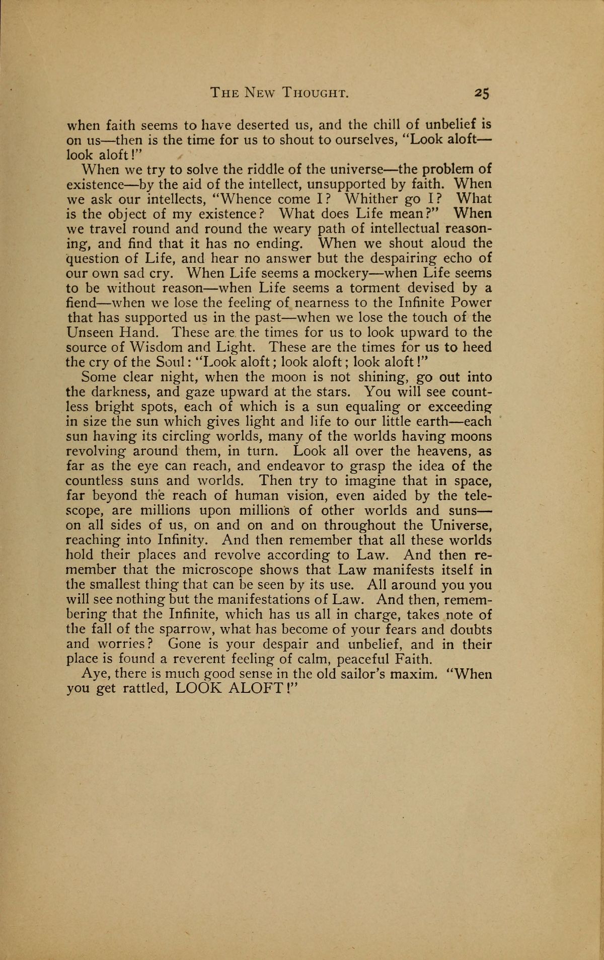Some clear night, when the moon is not shining, go out into the darkness, and gaze upward at the stars. You will see countless bright spots, each of which is a sun equaling or exceeding in size the sun which gives light and life to our little earth --- each sun having its circling worlds, many of the worlds having moons revolving around them, in turn. Look all over the heavens, as far as the eye can reach, and endeavor to grasp the idea of the countless suns and worlds. Then try to imagine that in space, far beyond the reach of human vision, even aided by the telescope, are millions upon millions of other worlds and suns --on all sides of us, on and on and on throughout the Universe, reaching into Infinity. And then remember that all these worlds hold their places and revolve according to Law. And then remember that the microscope shows that Law manifests itself in the smallest thing that can be seen by its use. All around you you will see nothing but the manifestations of Law. And then, remembering that the Infinite, which has us all in charge, takes note of the fall of the sparrow, what has become of your fears and doubts and worries? Gone is your despair and unbelief, and in their place is found a reverent feeling of calm, peaceful Faith.
