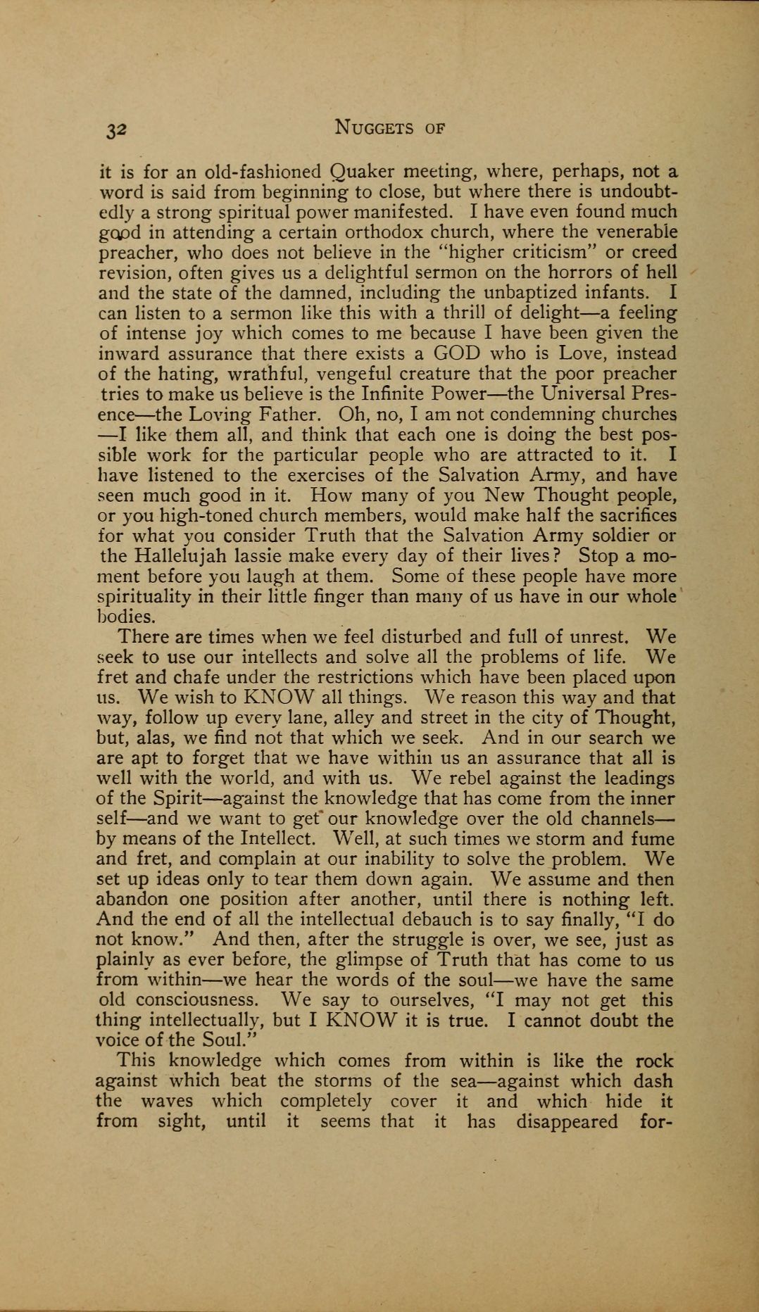it is for an old-fashioned Quaker meeting, where, perhaps, not a word is said from beginning to close, but where there is undoubtedly a strong spiritual power manifested. I have even found much good in attending a certain orthodox church, where the venerable preacher, who does not believe in the "higher criticism" or creed revision, often gives us a delightful sermon on the horrors of hell and the state of the damned, including the unbaptized infants. I can listen to a sermon like this with a thrill of delight --- a feeling of intense joy which comes to me because I have been given the inward assurance that there exists a GOD who is Love, instead of the hating, wrathful, vengeful creature that the poor preacher tries to make us believe is the Infinite Power --- the Universal Presence --- the Loving Father. Oh, no, I am not condemning churches --- I like them all, and think that each one is doing the best possible work for the particular people who are attracted to it. I have listened to the exercises of the Salvation Army, and have seen much good in it. How many of you New Thought people, or you high-toned church members, would make half the sacrifices for what you consider Truth that the Salvation Army soldier or the Hallelujah lassie make every day of their lives? Stop a moment before you laugh at them. Some of these people have more spirituality in their little finger than many of us have in our whole bodies.