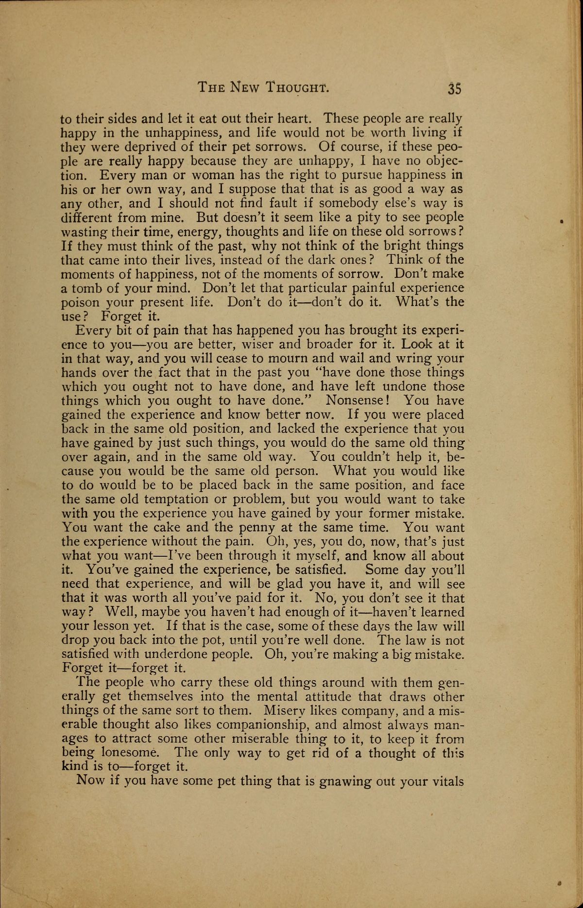 to their sides and let it eat out their heart. These people are really happy in the unhappiness, and life would not be worth living if they were deprived of their pet sorrows. Of course, if these people are really happy because they are unhappy, I have no objection. Every man or woman has the right to pursue happiness in his or her own way, and I suppose that that is as good a way as any other, and I should not find fault if somebody else's way is different from mine. But doesn't it seem like a pity to see people wasting their time, energy, thoughts and life on these old sorrows? If they must think of the past, why not think of the bright things that came into their lives, instead of the dark ones? Think of the moments of happiness, not of the moments of sorrow. Don't make a tomb of your mind. Don't let that particular painful experience poison your present life. Don't do it --- don't do it. What's the use? Forget it.