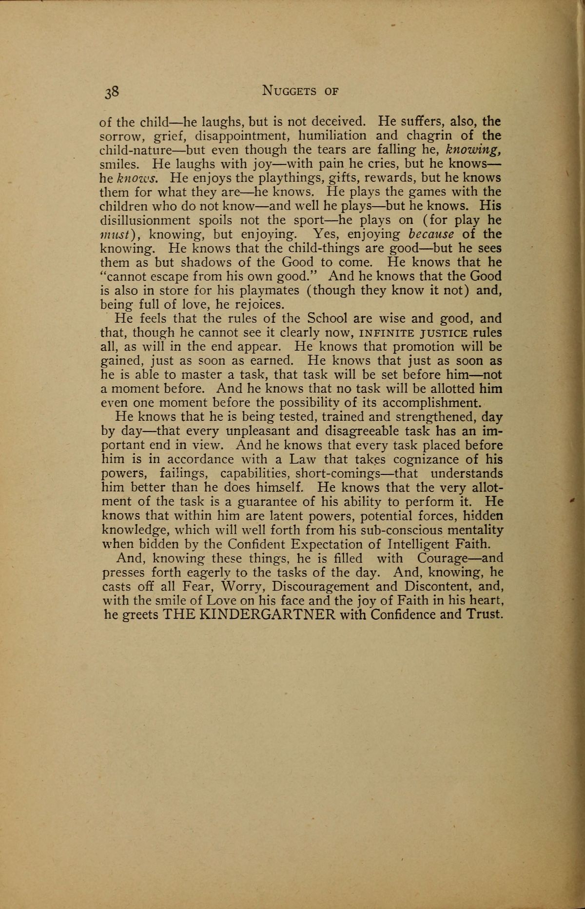 And, knowing these things, he is filled with Courage --- and presses forth eagerly to the tasks of the day. And, knowing, he casts off all Fear, Worry, Discouragement and Discontent, and, with the smile of Love on his face and the joy of Faith in his heart, he greets THE KINDERGARTNER with Confidence and Trust.