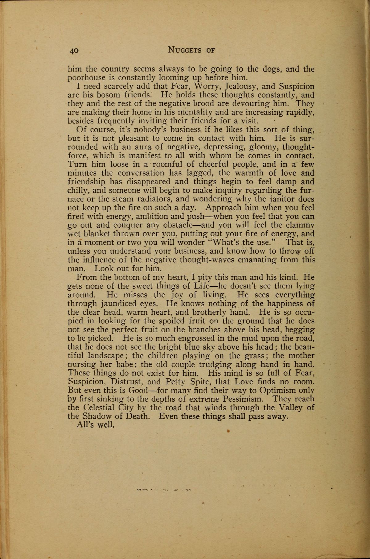 From the bottom of my heart, I pity this man and his kind. He gets none of the sweet things of Life --- he doesn't see them lying around. He misses the joy of living. He sees everything through jaundiced eyes. He knows nothing of the happiness of the clear head, warm heart, and brotherly hand. He is so occupied in looking for the spoiled fruit on the ground that he does not see the perfect fruit on the branches above his head, begging to be picked. He is so much engrossed in the mud upon the road, that he does not see the bright blue sky above his head; the beautiful landscape; the children playing on the grass; the mother nursing her babe; the old couple trudging along hand in hand. These things do not exist for him. His mind is so full of Fear, Suspicion, Distrust, and Petty Spite, that Love finds no room. But even this is Good --- for many find their way to Optimism only by first sinking to the depths of extreme Pessimism. They reach the Celestial City by the road that winds through the Valley of the Shadow of Death. Even these things shall pass away.