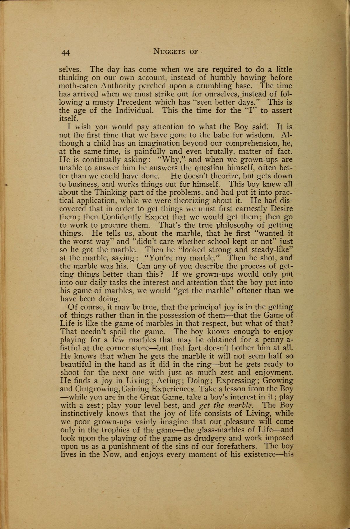 Of course, it may be true, that the principal joy is in the getting of things rather than in the possession of them --- that the Game of Life is like the game of marbles in that respect, but what of that? That needn't spoil the game. The boy knows enough to enjoy playing for a few marbles that may be obtained for a penny-a-fistful at the corner store --- but that fact doesn't bother him at all. He knows that when he gets the marble it will not seem half so beautiful in the hand as it did in the ring --- but he gets ready to shoot for the next one with just as much zest and enjoyment. He finds a joy in Living; Acting; Doing; Expressing; Growing and Outgrowing, Gaining Experiences. Take a lesson from the Boy --- while you are in the Great Game, take a boy's interest in it; play with a zest; play your level best, and get the marble. The Boy instinctively knows that the joy of life consists of Living, while we poor grown-ups vainly imagine that our pleasure will come only in the trophies of the game --- the glass-marbles of Life --- and look upon the playing of the game as drudgery and work imposed upon us as a punishment of the sins of our forefathers. The boy lives in the Now, and enjoys every moment of his existence --- his