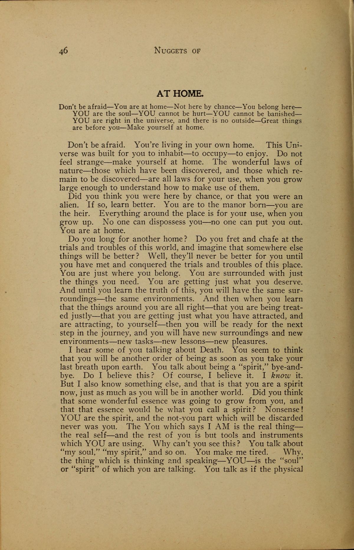Don't be afraid --- You are at home --- Not here by chance --- You belong here --YOU are the soul --- YOU cannot be hurt --- YOU cannot be banished --YOU are right in the universe, and there is no outside --- Great things are before you --- Make yourself at home.