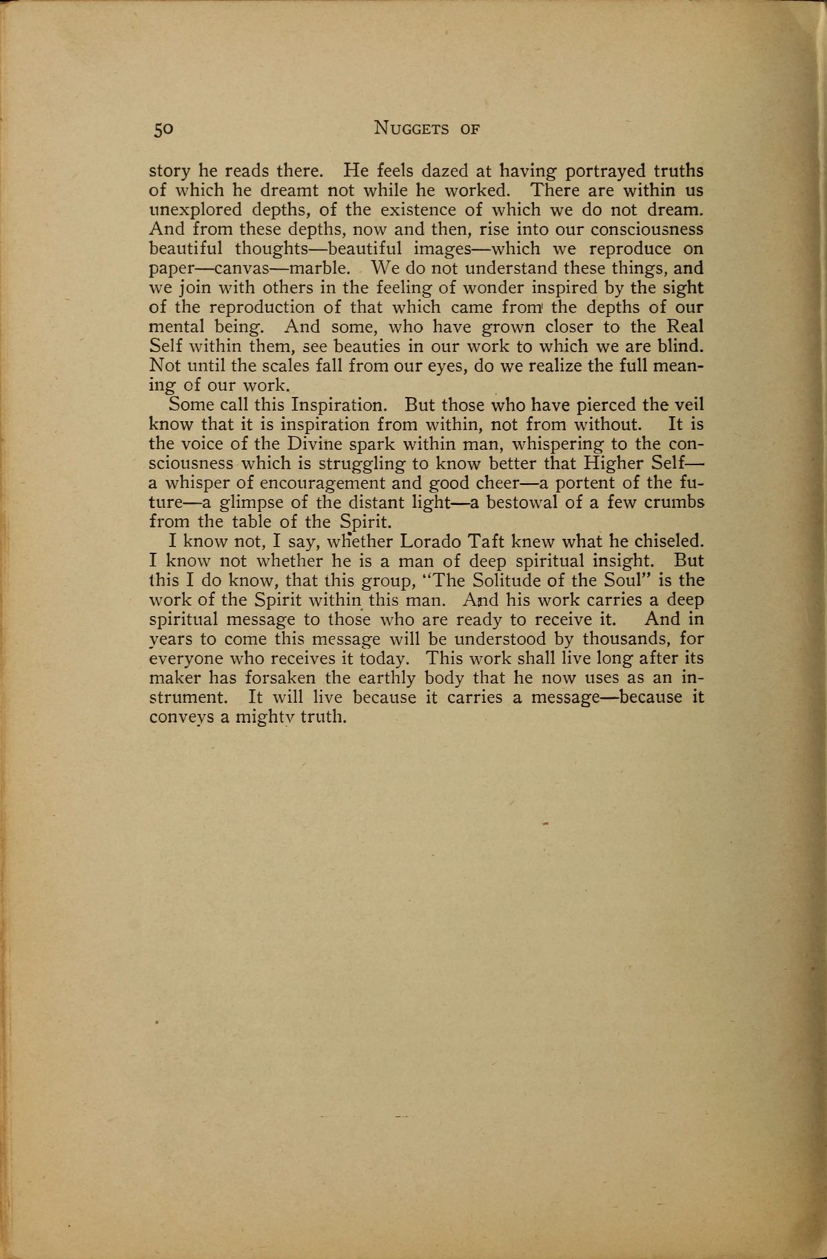 I know not, I say, whether Lorado Taft knew what he chiseled. I know not whether he is a man of deep spiritual insight. But this I do know, that this group, "The Solitude of the Soul" is the work of the Spirit within this man. And his work carries a deep spiritual message to those who are ready to receive it. And in years to come this message will be understood by thousands, for everyone who receives it today. This work shall live long after its maker has forsaken the earthly body that he now uses as an instrument. It will live because it carries a message --- because it conveys a mighty truth.