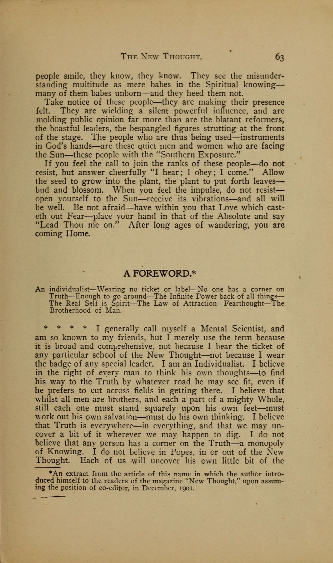 * * * * I generally call myself a Mental Scientist, and am so known to my friends, but I merely use the term because it is broad and comprehensive, not because I bear the ticket of any particular school of the New Thought --- not because I wear the badge of any special leader. I am an Individualist. I believe in the right of every man to think his own thoughts --- to find his way to the Truth by whatever road he may see fit, even if he prefers to cut across fields in getting there. I believe that whilst all men are brothers, and each a part of a mighty Whole, still each one must stand squarely upon his own feet --- must work out his own salvation --- must do his own thinking. I believe that Truth is everywhere --- in everything, and that we may uncover a bit of it wherever we may happen to dig. I do not believe that any person has a corner on the Truth --- a monopoly of Knowing. I do not believe in Popes, in or out of the New Thought. Each of us will uncover his own little bit of the