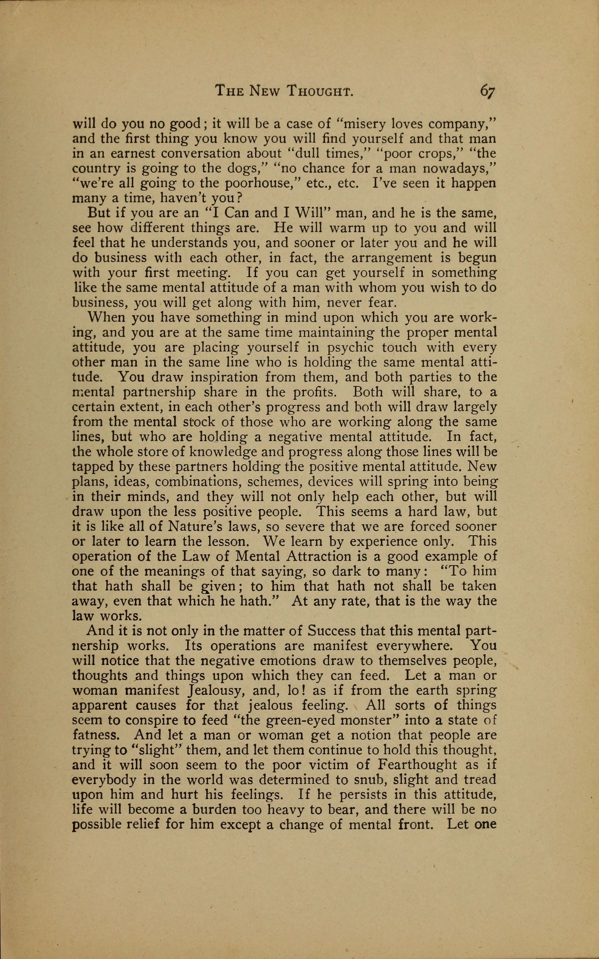 And it is not only in the matter of Success that this mental partnership works. Its operations are manifest everywhere. You will notice that the negative emotions draw to themselves people, thoughts and things upon which they can feed. Let a man or woman manifest Jealousy, and, lo! as if from the earth spring apparent causes for that jealous feeling. All sorts of things seem to conspire to feed "the green-eyed monster" into a state of fatness. And let a man or woman get a notion that people are trying to "slight" them, and let them continue to hold this thought, and it will soon seem to the poor victim of Fearthought as if everybody in the world was determined to snub, slight and tread upon him and hurt his feelings. If he persists in this attitude, life will become a burden too heavy to bear, and there will be no possible relief for him except a change of mental front. Let one