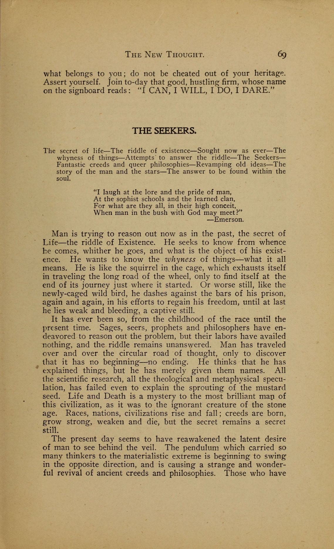 Man is trying to reason out now as in the past, the secret of Life --- the riddle of Existence. He seeks to know from whence he comes, whither he goes, and what is the object of his existence. He wants to know the whyness of things --- what it all means. He is like the squirrel in the cage, which exhausts itself in traveling the long road of the wheel, only to find itself at the end of its journey just where it started. Or worse still, like the newly-caged wild bird, he dashes against the bars of his prison, again and again, in his efforts to regain his freedom, until at last he lies weak and bleeding, a captive still.