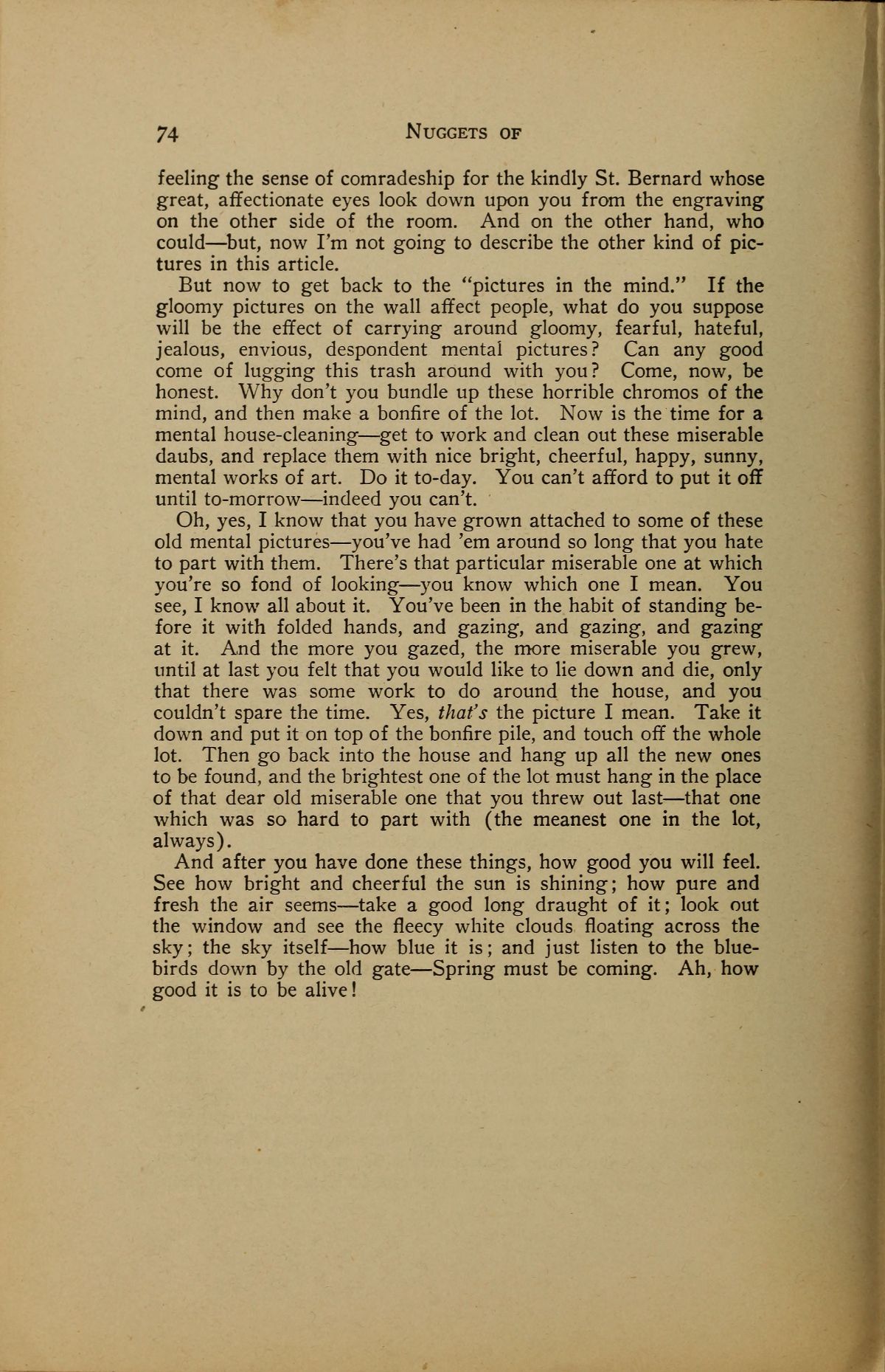 Oh, yes, I know that you have grown attached to some of these old mental pictures --- you've had 'em around so long that you hate to part with them. There's that particular miserable one at which you're so fond of looking --- you know which one I mean. You see, I know all about it. You've been in the habit of standing before it with folded hands, and gazing, and gazing, and gazing at it. And the more you gazed, the more miserable you grew, until at last you felt that you would like to lie down and die, only that there was some work to do around the house, and you couldn't spare the time. Yes, that's the picture I mean. Take it down and put it on top of the bonfire pile, and touch off the whole lot. Then go back into the house and hang up all the new ones to be found, and the brightest one of the lot must hang in the place of that dear old miserable one that you threw out last --- that one which was so hard to part with (the meanest one in the lot, always).