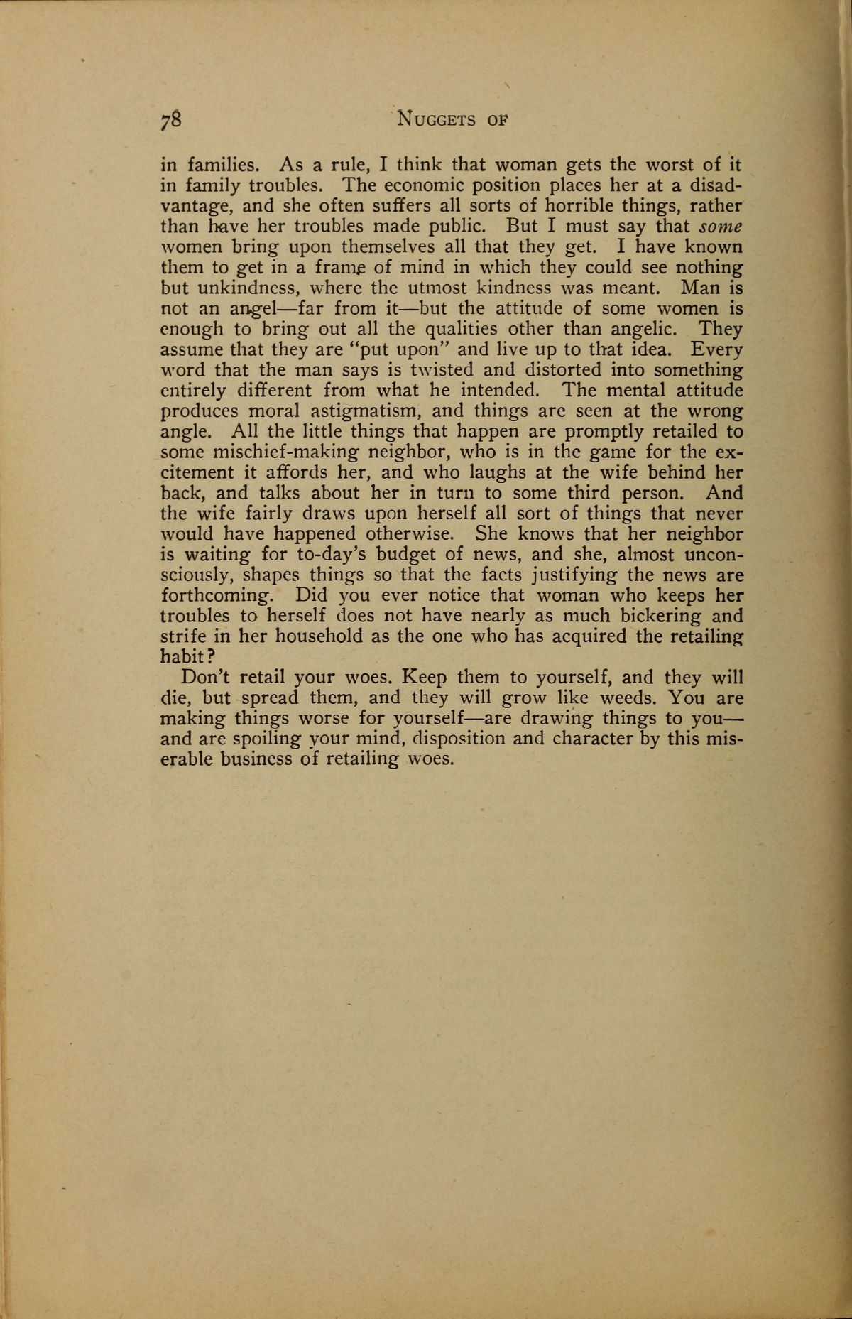 in families. As a rule, I think that woman gets the worst of it in family troubles. The economic position places her at a disadvantage, and she often suffers all sorts of horrible things, rather than have her troubles made public. But I must say that some women bring upon themselves all that they get. I have known them to get in a frame of mind in which they could see nothing but unkindness, where the utmost kindness was meant. Man is not an angel --- far from it --- but the attitude of some women is enough to bring out all the qualities other than angelic. They assume that they are "put upon" and live up to that idea. Every word that the man says is twisted and distorted into something entirely different from what he intended. The mental attitude produces moral astigmatism, and things are seen at the wrong angle. All the little things that happen are promptly retailed to some mischief-making neighbor, who is in the game for the excitement it affords her, and who laughs at the wife behind her back, and talks about her in turn to some third person. And the wife fairly draws upon herself all sort of things that never would have happened otherwise. She knows that her neighbor is waiting for to-day's budget of news, and she, almost unconsciously, shapes things so that the facts justifying the news are forthcoming. Did you ever notice that woman who keeps her troubles to herself does not have nearly as much bickering and strife in her household as the one who has acquired the retailing habit?
