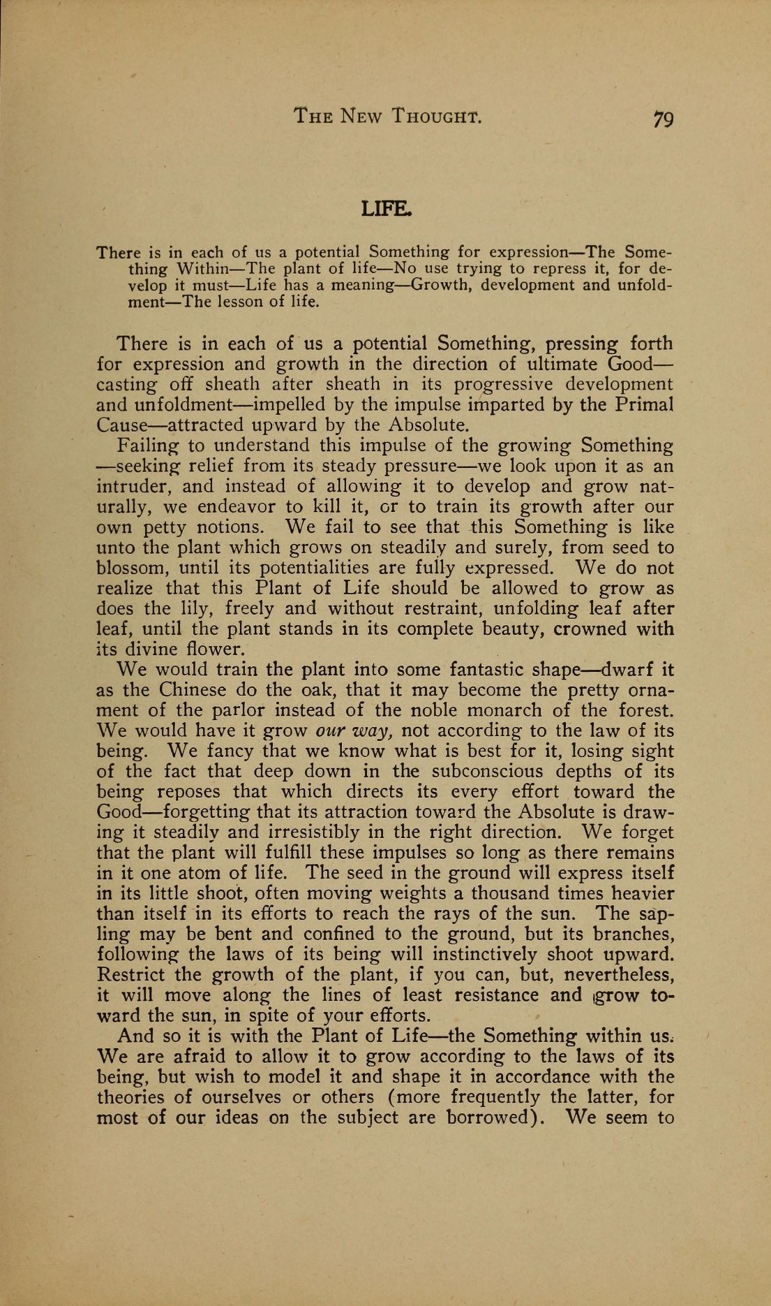 We would train the plant into some fantastic shape --- dwarf it as the Chinese do the oak, that it may become the pretty ornament of the parlor instead of the noble monarch of the forest. We would have it grow our way, not according to the law of its being. We fancy that we know what is best for it, losing sight of the fact that deep down in the subconscious depths of its being reposes that which directs its every effort toward the Good --- forgetting that its attraction toward the Absolute is drawing it steadily and irresistibly in the right direction. We forget that the plant will fulfill these impulses so long as there remains in it one atom of life. The seed in the ground will express itself in its little shoot, often moving weights a thousand times heavier than itself in its efforts to reach the rays of the sun. The sapling may be bent and confined to the ground, but its branches, following the laws of its being will instinctively shoot upward. Restrict the growth of the plant, if you can, but, nevertheless, it will move along the lines of least resistance and (grow toward the sun, in spite of your efforts.
