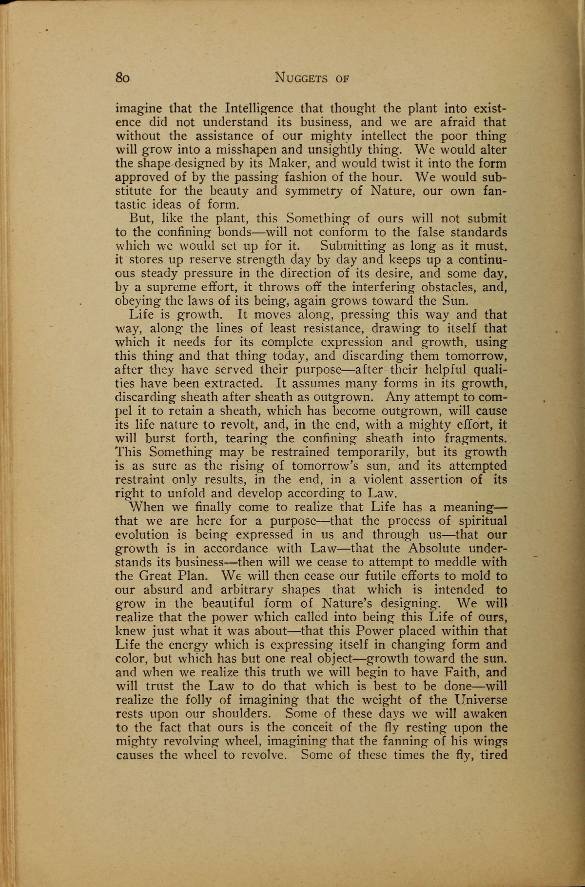 When we finally come to realize that Life has a meaning --that we are here for a purpose --- that the process of spiritual evolution is being expressed in us and through us --- that our growth is in accordance with Law --- that the Absolute understands its business --- then will we cease to attempt to meddle with the Great Plan. We will then cease our futile efforts to mold to our absurd and arbitrary shapes that which is intended to grow in the beautiful form of Nature's designing. We will realize that the power which called into being this Life of ours, knew just what it was about --- that this Power placed within that Life the energy which is expressing itself in changing form and color, but which has but one real object --- growth toward the sun. and when we realize this truth we will begin to have Faith, and will trust the Law to do that which is best to be done --- will realize the folly of imagining that the weight of the Universe rests upon our shoulders. Some of these days we will awaken to the fact that ours is the conceit of the fly resting upon the mighty revolving wheel, imagining that the fanning of his wings causes the wheel to revolve. Some of these times the fly, tired