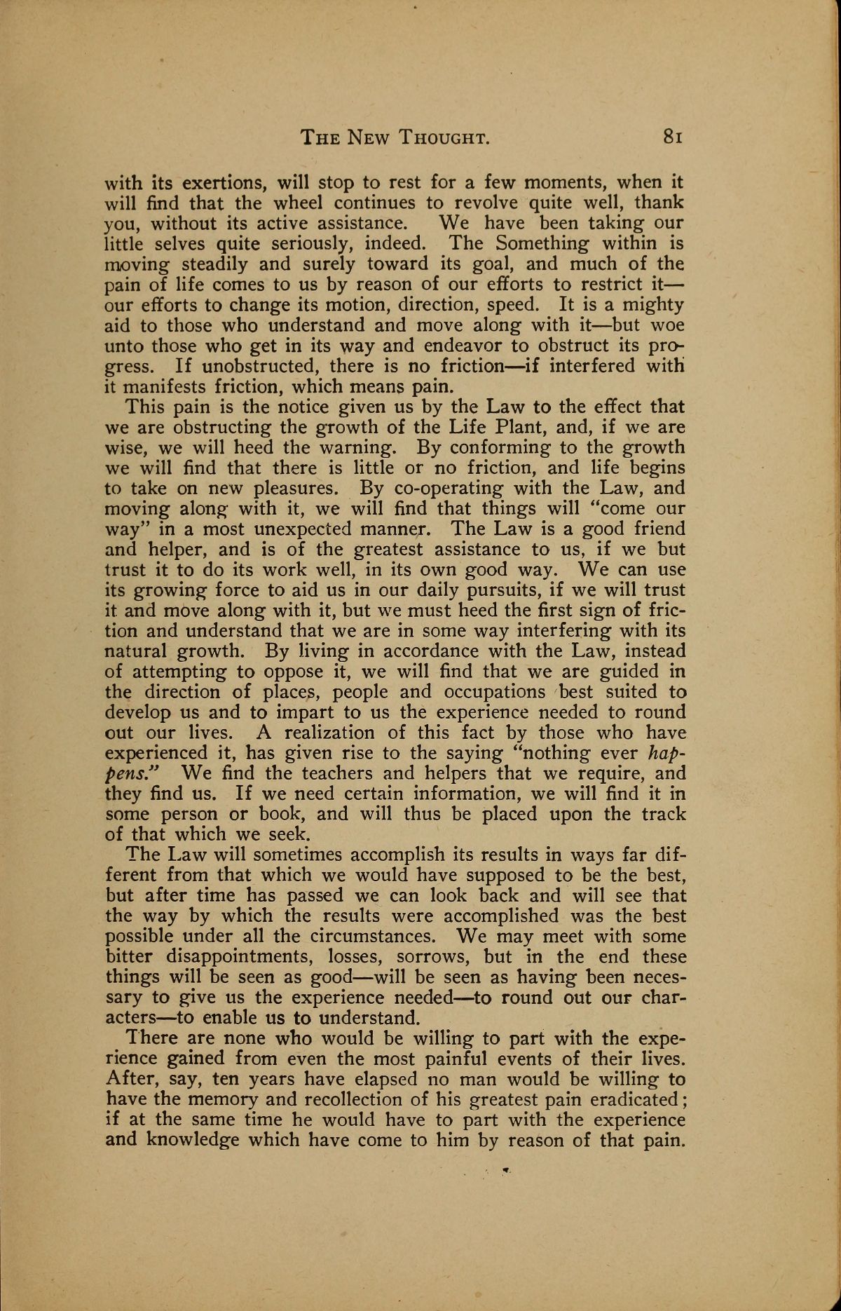 This pain is the notice given us by the Law to the effect that we are obstructing the growth of the Life Plant, and, if we are wise, we will heed the warning. By conforming to the growth we will find that there is little or no friction, and life begins to take on new pleasures. By co-operating with the Law, and moving along with it, we will find that things will "come our way" in a most unexpected manner. The Law is a good friend and helper, and is of the greatest assistance to us, if we but trust it to do its work well, in its own good way. We can use its growing force to aid us in our daily pursuits, if we will trust it and move along with it, but we must heed the first sign of friction and understand that we are in some way interfering with its natural growth. By living in accordance with the Law, instead of attempting to oppose it, we will find that we are guided in the direction of places, people and occupations best suited to develop us and to impart to us the experience needed to round out our lives. A realization of this fact by those who have experienced it, has given rise to the saying "nothing ever happens" We find the teachers and helpers that we require, and they find us. If we need certain information, we will find it in some person or book, and will thus be placed upon the track of that which we seek.