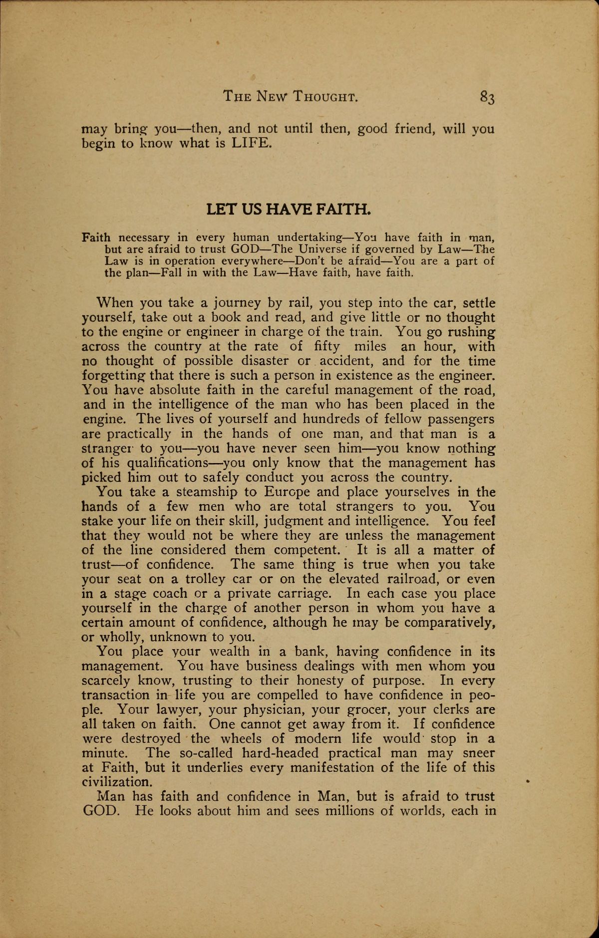 You place your wealth in a bank, having confidence in its management. You have business dealings with men whom you scarcely know, trusting to their honesty of purpose. In every transaction in life you are compelled to have confidence in people. Your lawyer, your physician, your grocer, your clerks are all taken on faith. One cannot get away from it. If confidence were destroyed the wheels of modern life would stop in a minute. The so-called hard-headed practical man may sneer at Faith, but it underlies every manifestation of the life of this civilization.