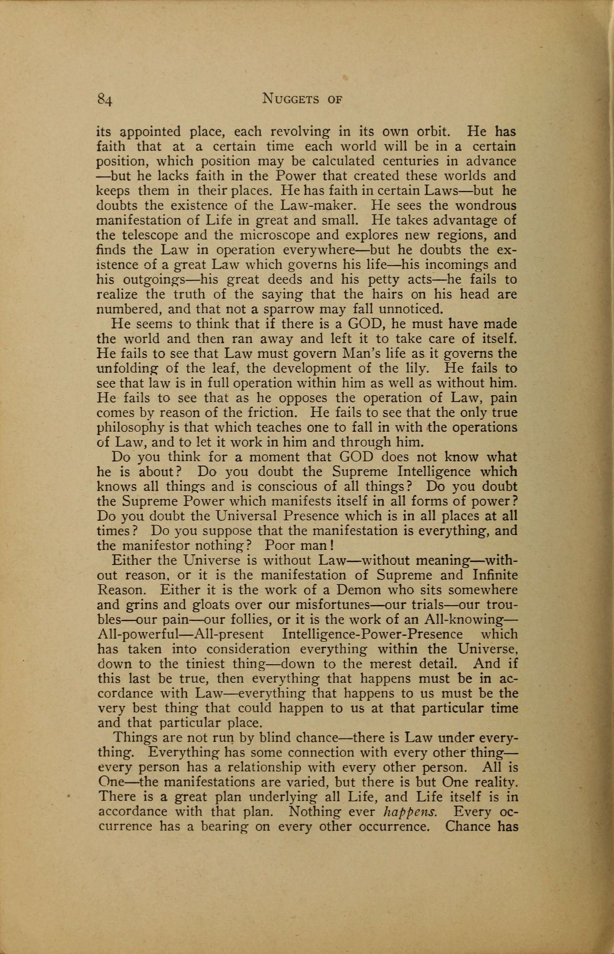 its appointed place, each revolving in its own orbit. He has faith that at a certain time each world will be in a certain position, which position may be calculated centuries in advance --- but he lacks faith in the Power that created these worlds and keeps them in their places. He has faith in certain Laws --- but he doubts the existence of the Law-maker. He sees the wondrous manifestation of Life in great and small. He takes advantage of the telescope and the microscope and explores new regions, and finds the Law in operation everywhere --- but he doubts the existence of a great Law which governs his life --- his incomings and his outgoings --- his great deeds and his petty acts --- he fails to realize the truth of the saying that the hairs on his head are numbered, and that not a sparrow may fall unnoticed.