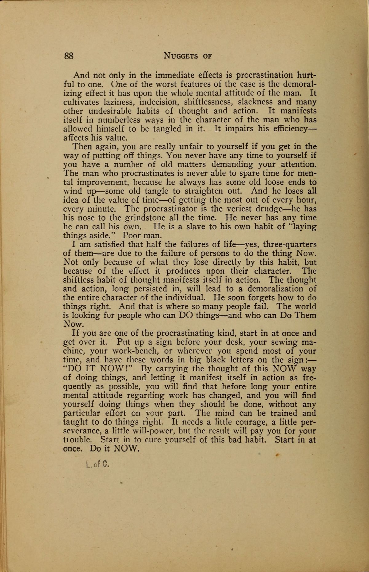Then again, you are really unfair to yourself if you get in the way of putting off things. You never have any time to yourself if you have a number of old matters demanding your attention. The man who procrastinates is never able to spare time for mental improvement, because he always has some old loose ends to wind up --- some old tangle to straighten out. And he loses all idea of the value of time --- of getting the most out of every hour, every minute. The procrastinator is the veriest drudge --- he has his nose to the grindstone all the time. He never has any time he can call his own. He is a slave to his own habit of "laying things aside." Poor man.