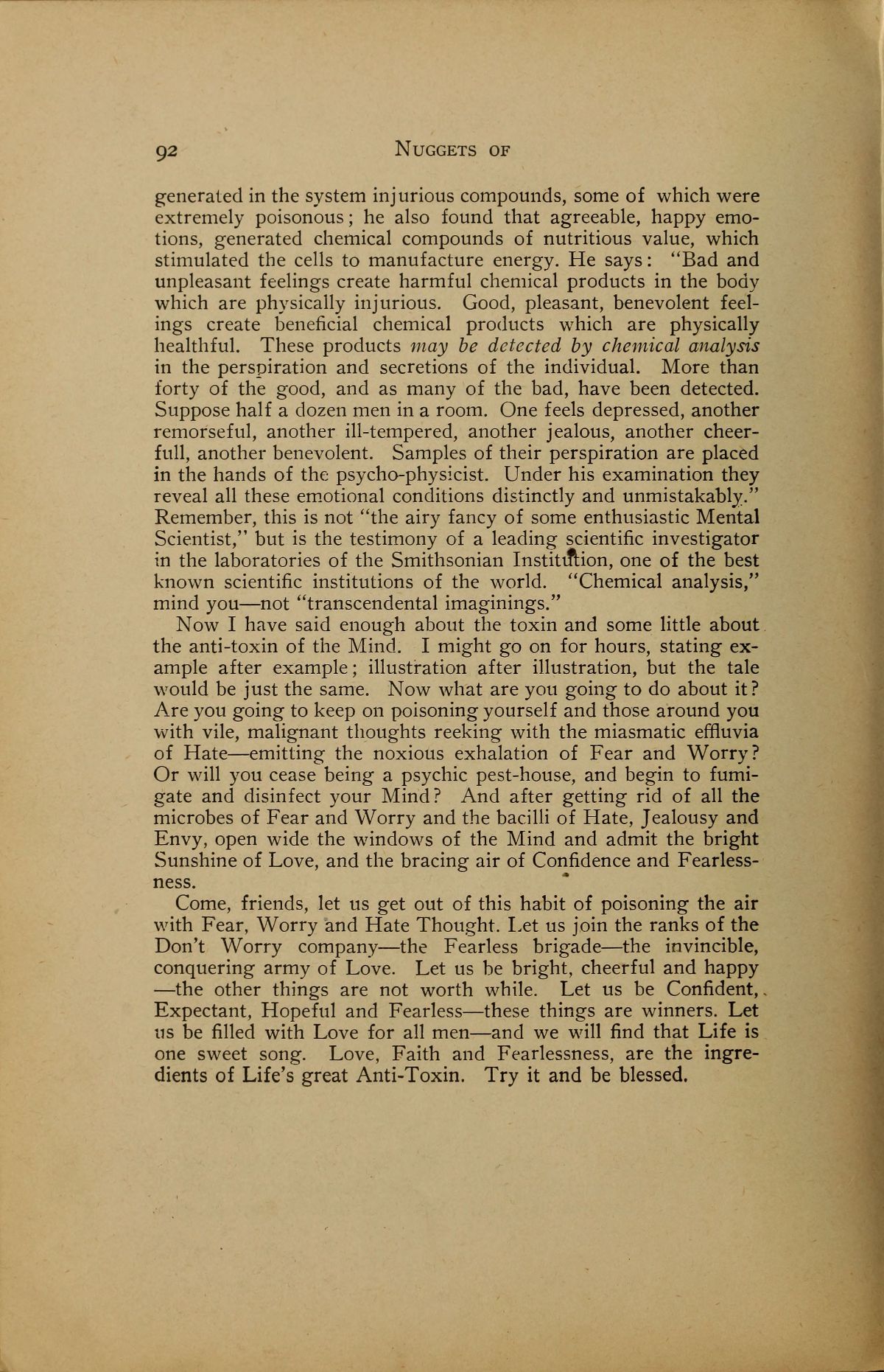 generated in the system injurious compounds, some of which were extremely poisonous; he also found that agreeable, happy emotions, generated chemical compounds of nutritious value, which stimulated the cells to manufacture energy. He says: "Bad and unpleasant feelings create harmful chemical products in the body which are physically injurious. Good, pleasant, benevolent feelings create beneficial chemical products which are physically healthful. These products may be detected by chemical analysis in the perspiration and secretions of the individual. More than forty of the good, and as many of the bad, have been detected. Suppose half a dozen men in a room. One feels depressed, another remorseful, another ill-tempered, another jealous, another cheerfull, another benevolent. Samples of their perspiration are placed in the hands of the psycho-physicist. Under his examination they reveal all these emotional conditions distinctly and unmistakably." Remember, this is not "the airy fancy of some enthusiastic Mental Scientist," but is the testimony of a leading scientific investigator in the laboratories of the Smithsonian Institution, one of the best known scientific institutions of the world. "Chemical analysis," mind you --- not "transcendental imaginings."