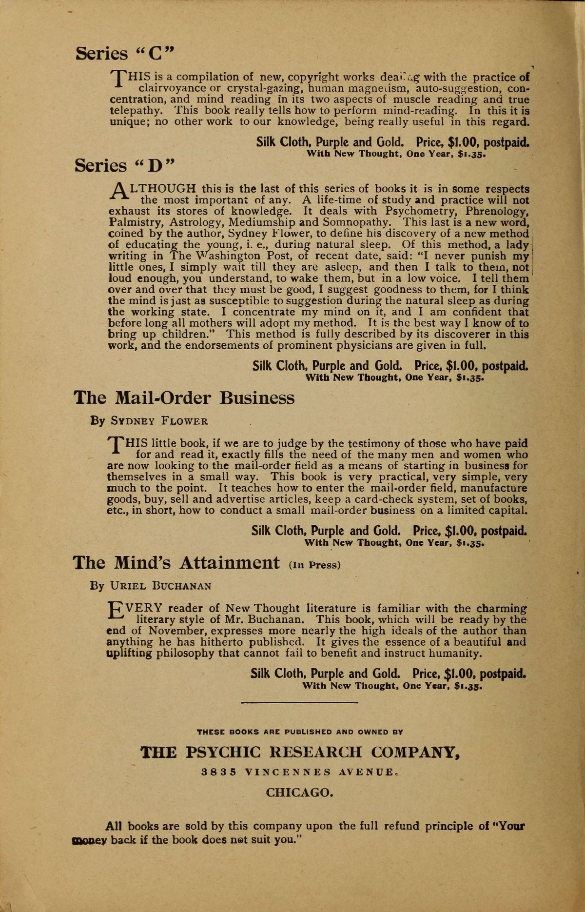 ALTHOUGH this is the last of this series of books it is in some respects the most important of any. A life-time of study and practice will not exhaust its stores of knowledge. It deals with Psychometry, Phrenology, Palmistry, Astrology, Mediumship and Somnopathy. This last is a new word, coined by the author, Sydney Flower, to define his discovery of a new method j of educating the young, i. e., during natural sleep. Of this method, a lady I writing in The Washington Post, of recent date, said: "I never punish my| little ones, I simply wait till they are asleep, and then I talk to them, not; loud enough, you understand, to wake them, but in a low voice. I tell them over and over that they must be good, I suggest goodness to them, for I think the mind is just as susceptible to suggestion during the natural sleep as during the working state. I concentrate my mind on it, and I am confident that before long all mothers will adopt my method. It is the best way I know of to bring up children." This method is fully described by its discoverer in this work, and the endorsements of prominent physicians are given in full.