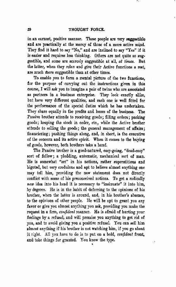 The Passive brother is a good-natured, easy-going, "dead-easy" sort of fellow; a plodding, automatic, mechanical sort of man. He is somewhat "set" in his notions, rather superstitious and bigoted, but very credulous and apt to believe almost anything one may tell him, providing the new statement does not directly conflict with some of his preconceived notions. To get a radically new idea into his head it is necessary to "insinuate" it into him, by degrees. He is in the habit of deferring to the opinions of his brother, when the latter is around, and, in his brother's absence, to the opinions of other people. He will be apt to grant you any favor, to give you almost anything you ask, providing you make the request in a firm, confident manner. He is afraid of hurting your feelings by a refusal, and will promise you anything to get rid of you, and to avoid giving you a positive refusal. You can sell him almost anything if his brother is not watching him, if you go about it right. All you have to do is to put on a bold, confident front, and take things for granted. You know the type.